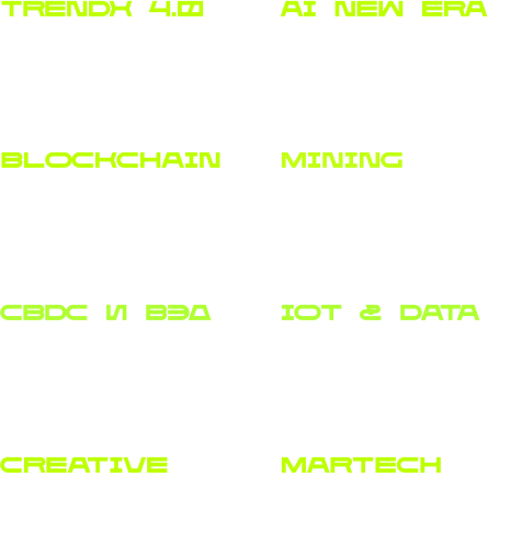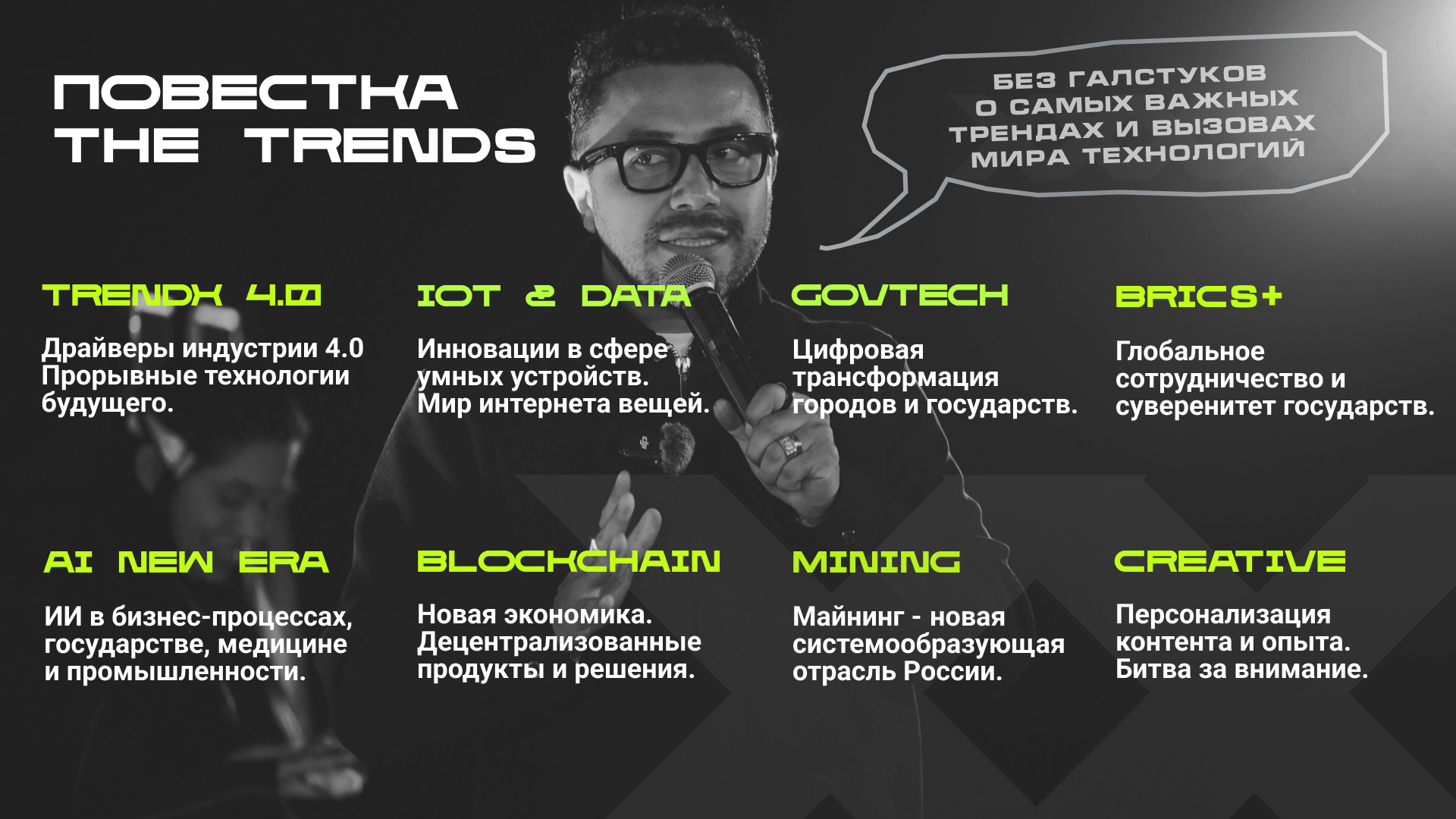 The Trends - ведущий международный форум-выставка новейших технологий в Москве. В этом году мы усилим программу треками для крупного бизнеса и международного сотрудничества. Благодаря присутствию технологических лидеров, лиц, принимающих решения, инвесторов и государственных деятелей, охватывающих 15 ключевых секторов технологического бизнеса, The Trends служит катализатором для заключения партнерств, привлечения инвестиций и внедрения инноваций.