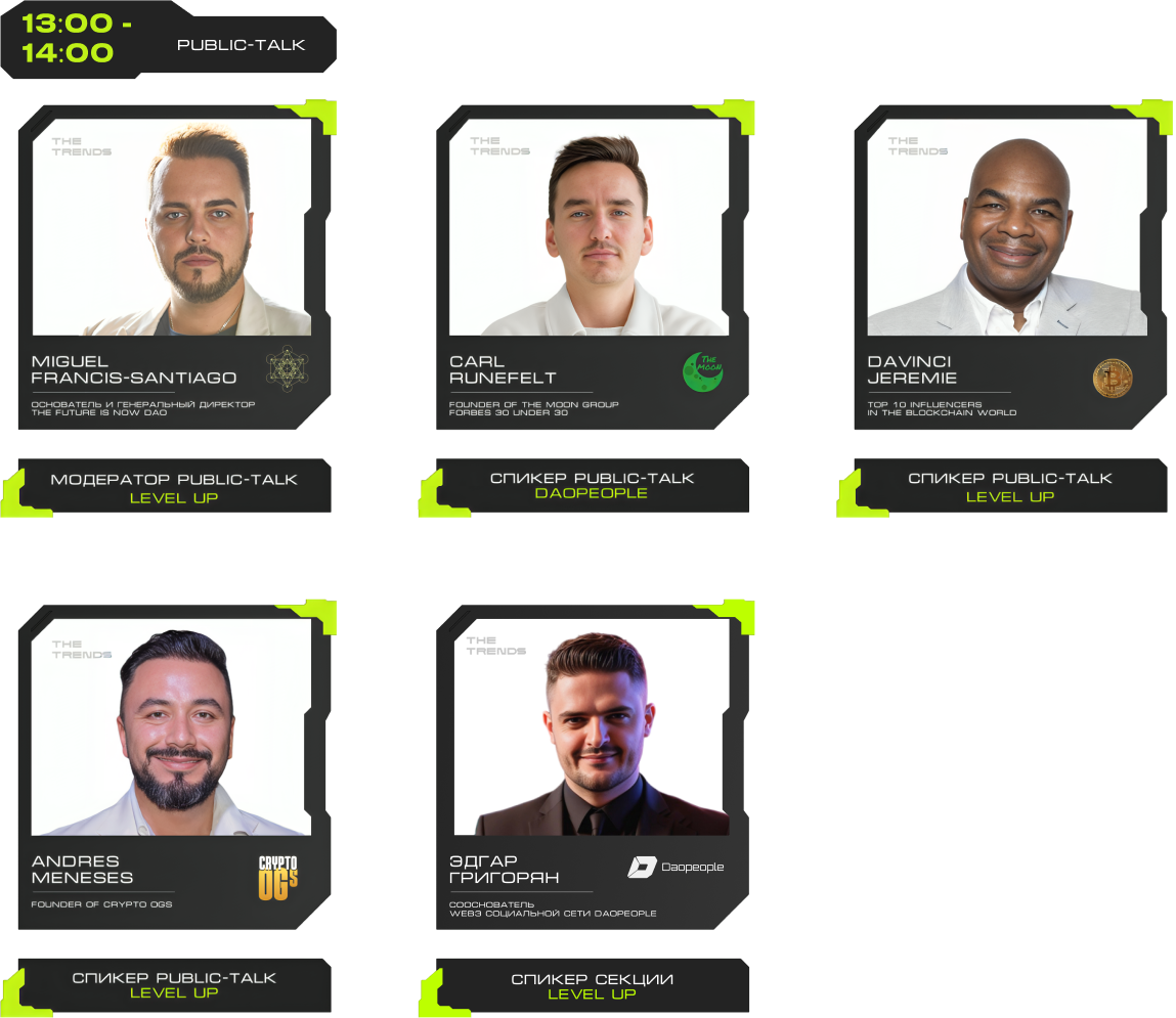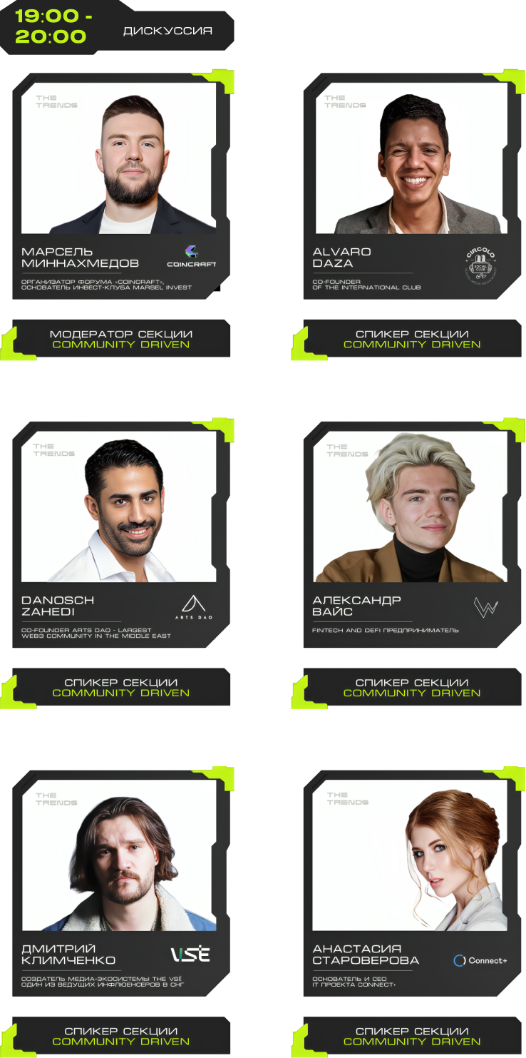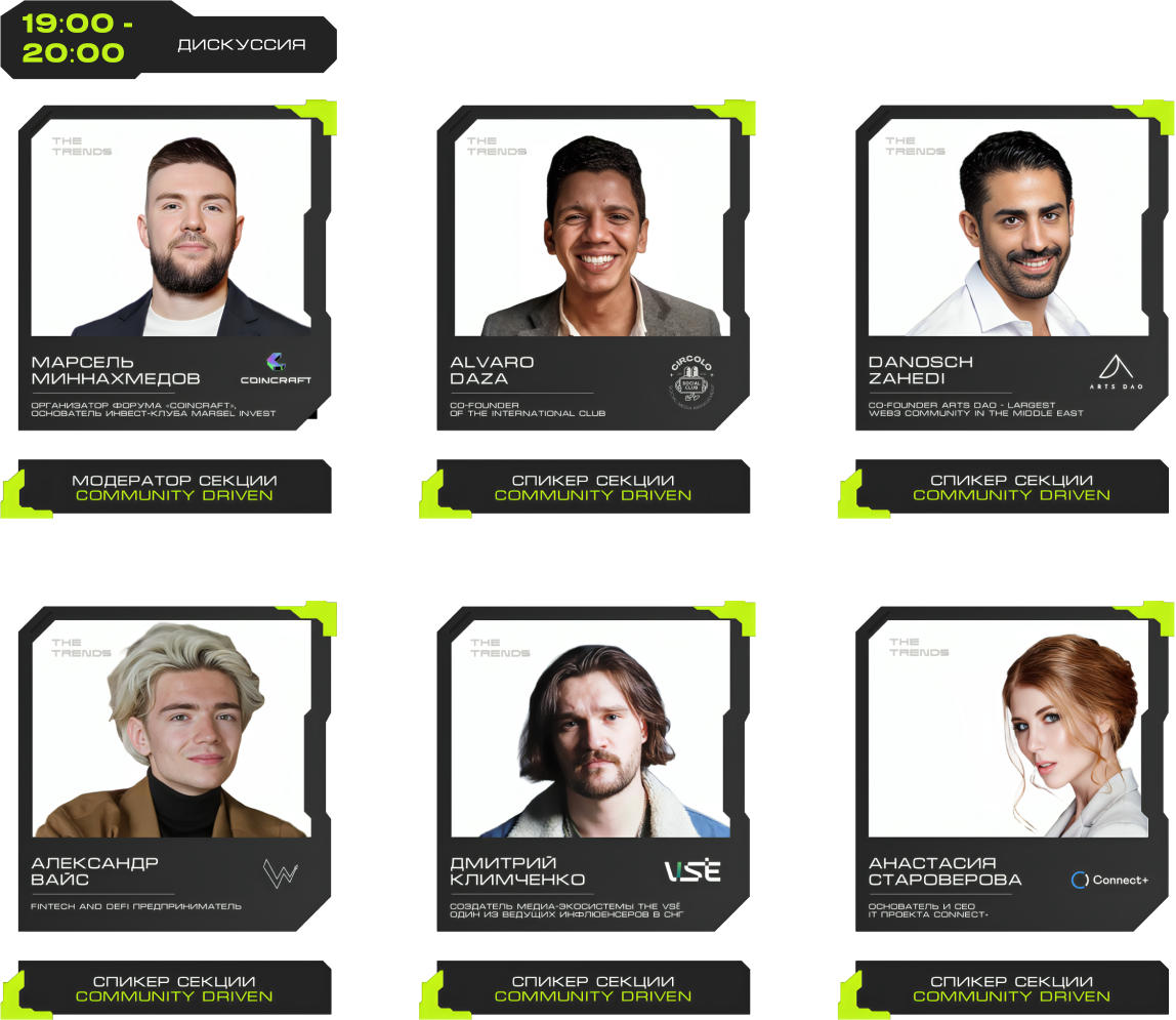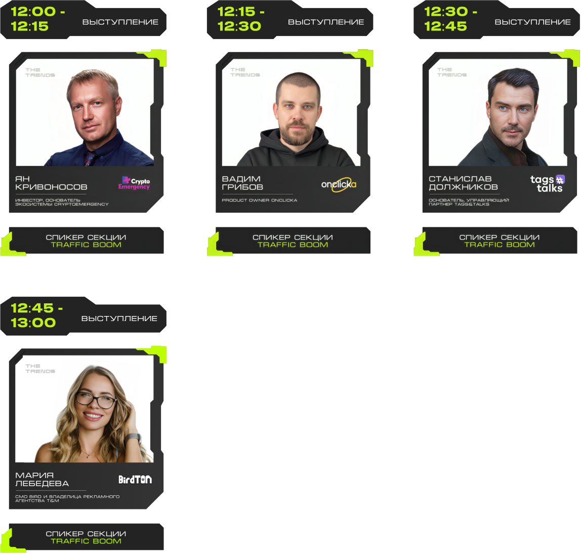 J'JO, TRON, OKX, 0XProcessing, ICE LAB, BitGet, Ассоциация Промышленного Майнинга, BingX, Regolith, IBMM, MINING CLUSTER, LEOMINING, Fintopio, BitCube Server, Storm Trade, Hellopixel, Energo, X11, Смешарики, Regolith, KEINE EXCHANGE, 4Ex, COEX, Safewallet, Tags&Talks, ProBlockchain Media, Спутник, АО “Нейросети”, YoYo Swap, AG Soft, Architec.Ton, VORPAL, GMT LEGAL, POPCORN CAPITALS, SAS, BRIDGE, Crypto Emergency, STEPNGO, OnClickA, MunGame, ATF Media, Whales KOLs, Marsel Invest, cryptoOKO, Profsouz, Neurovision, Flopi, DrinkSome, DDAO3.0, Portal VR